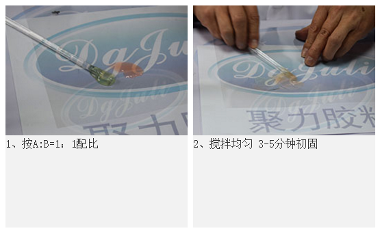 2、AB膠使用時(shí)將A、B組分按1:1比例混合攪拌均勻,涂于被粘物表面,